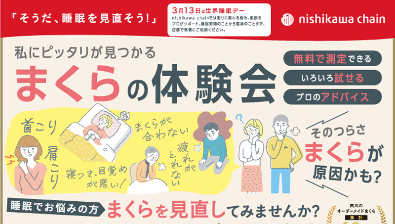 まくらとマットレス体験会のお知らせ WEBチラシ 2026.03.12 本日からまくらとマットレスの体験会の新聞折り込みを入れてます。WBCで大活躍している大谷翔平と西川のキャンペーンもやっております。 肩こりや腰痛、など気になる方はこの機会に一度ご来店ください。お待ちしております。