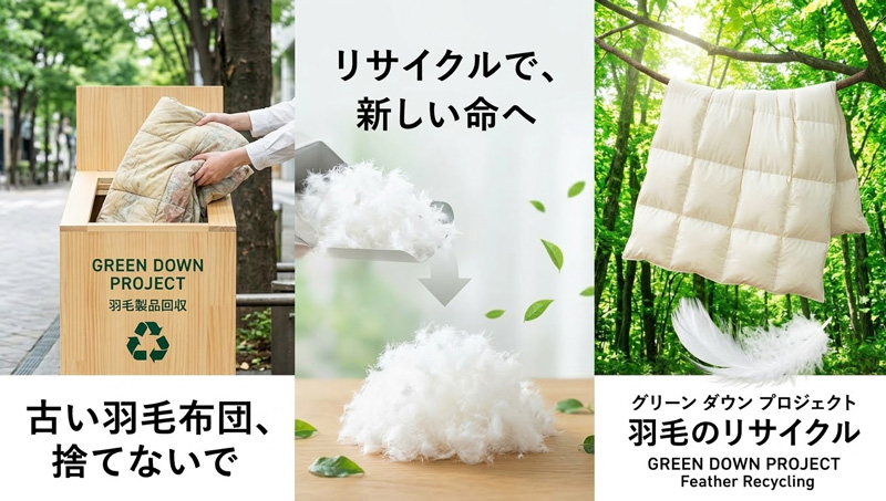 これは、お客様からお預かりした羽毛布団を回収し、羽毛を洗浄・乾燥させて再利用する取り組みです。