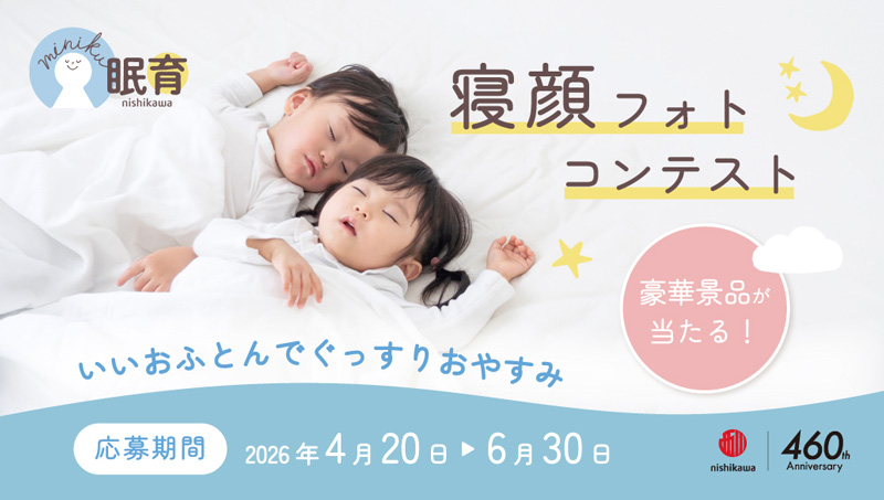 お子様のとっておきの寝顔写真を大募集!nishikawaの眠育フォトコンテスト。2026年4月20日〜6月30日開催。キッズモデルデビュー権・AiRマットレスなど豪華景品が当たります。LINEから簡単応募!